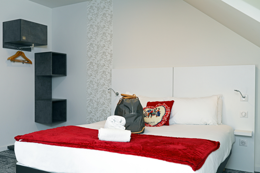 Disfrute de la comodidad de nuestra habitación doble para su estadía en Alsacia. Descubra nuestra encantadora habitación doble abuhardillada en su Hotel The Originals Mulhouse Est. La habitación doble tiene una superficie de 17 m² y está equipada con: - Una cama de 160×190 y un escritorio - Un baño privado con ducha - Un toallero - portaequipajes y armario - Televisor de pantalla plana y conexión Wifi gratuita - Una bandeja de cortesía
